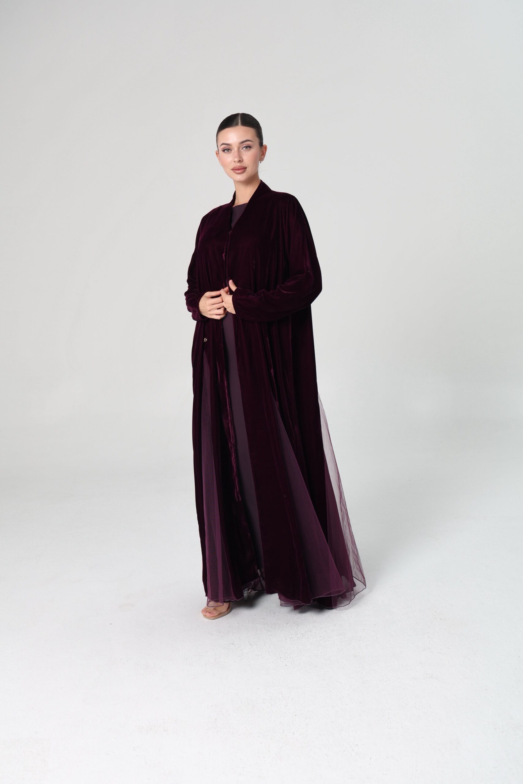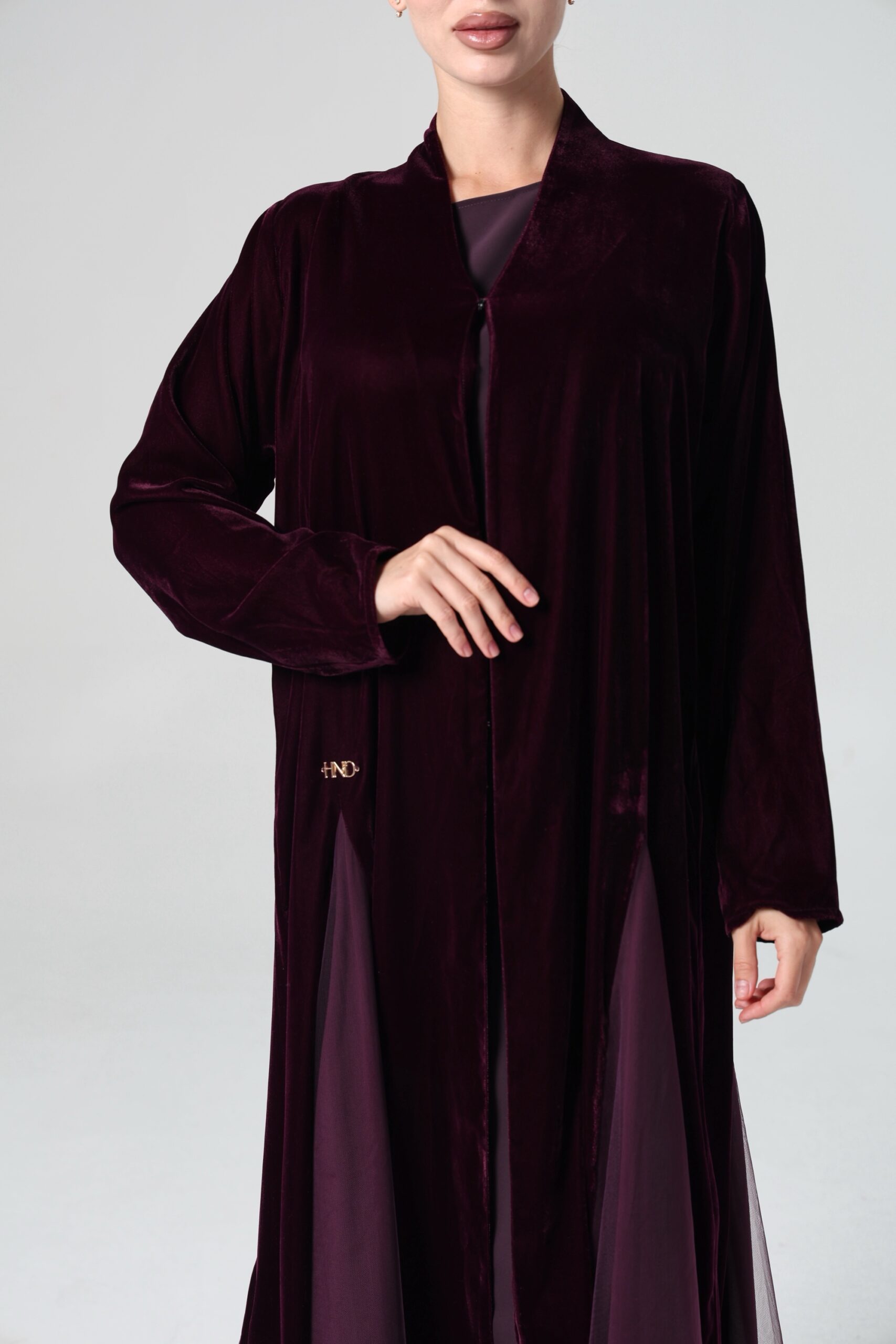 A luxurious winter velvet abaya enhanced with refined tulle openings that create an elegant, gown-like flow.
